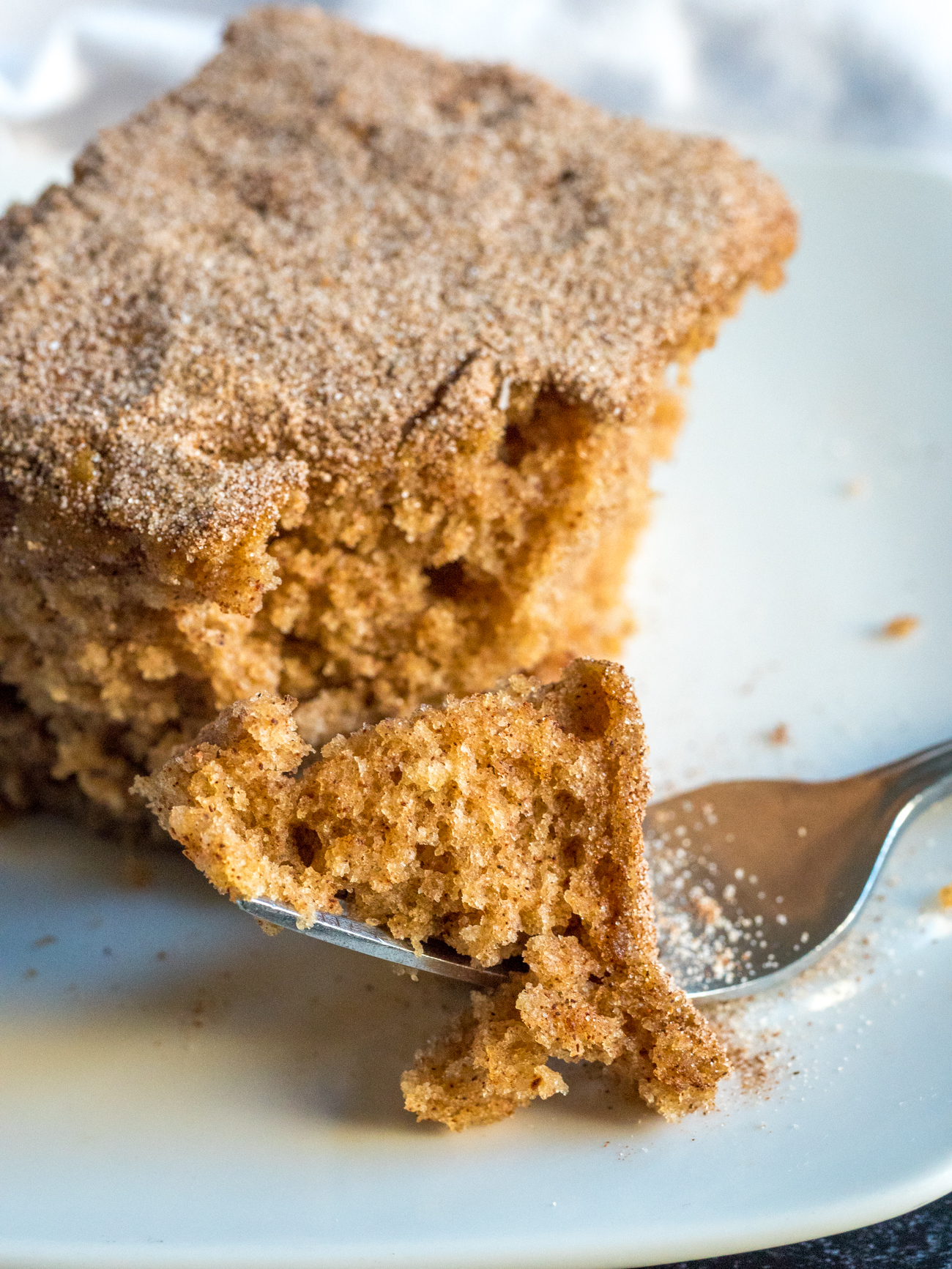 - While the cake bakes, stir together the cinnamon and sugar for the topping. While cake is still hot, sprinkle with cinnamon sugar. Let cool, slice, and serve. Enjoy!