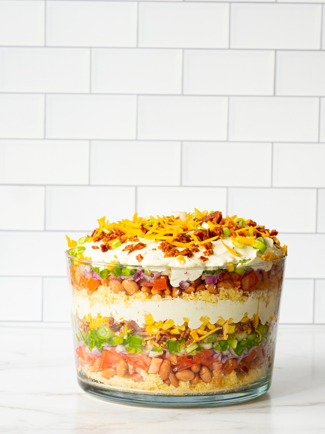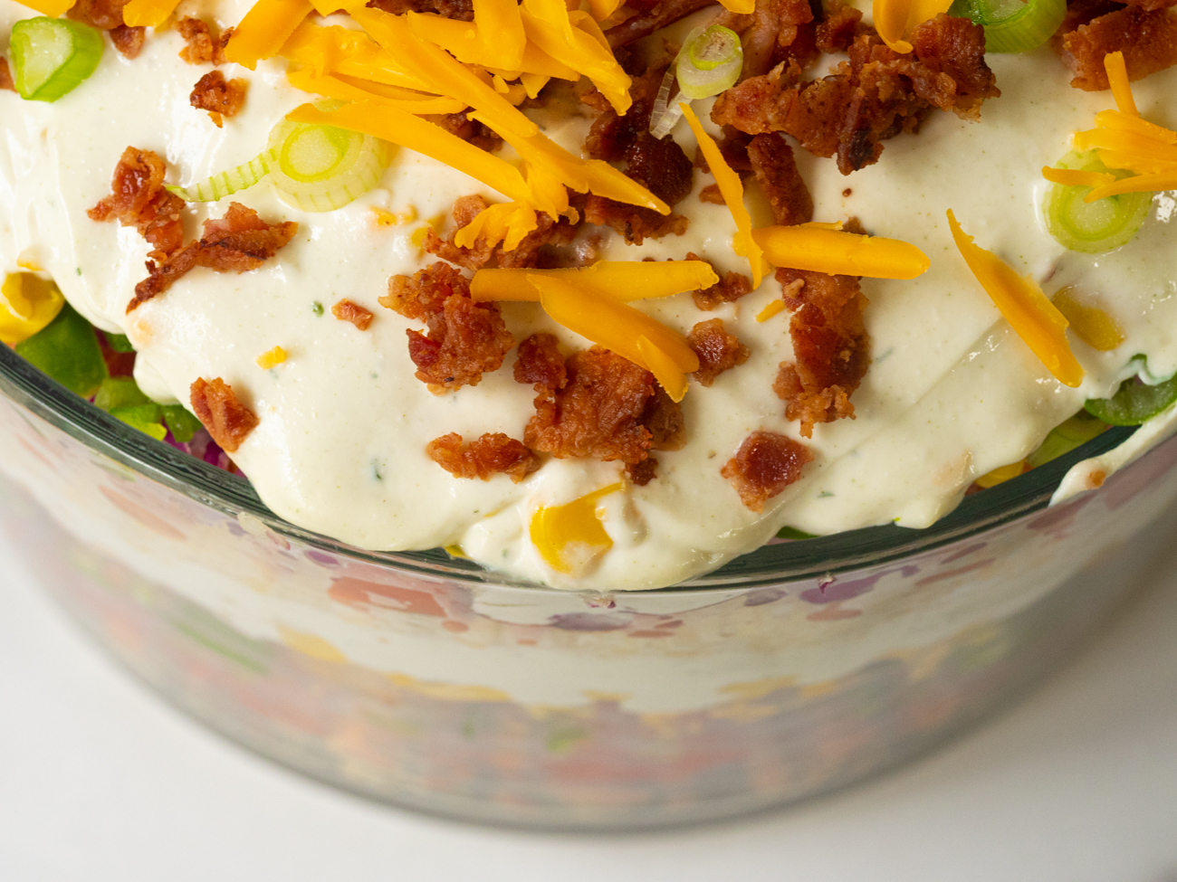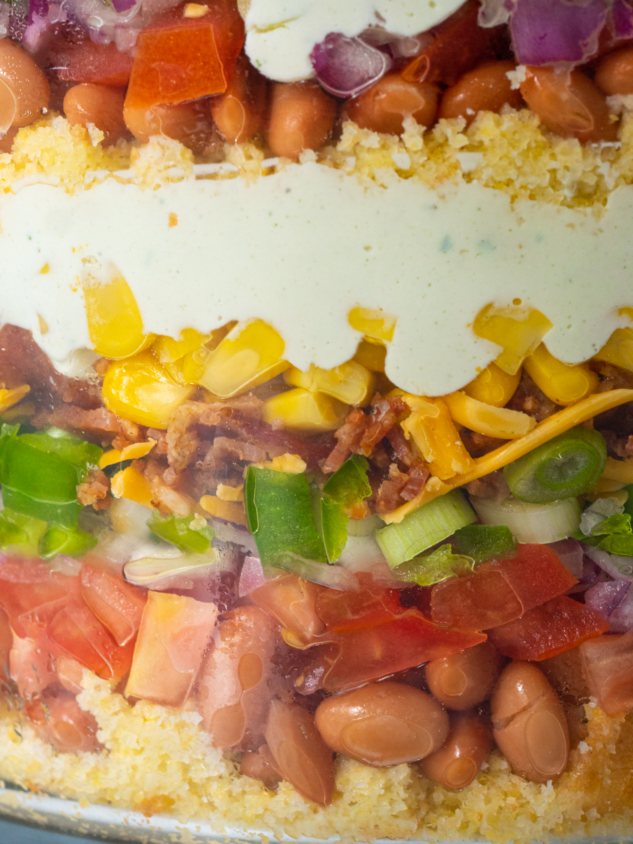 Those are chopped and layered with the crumbled cornbread, some pinto beans, cheddar cheese, and corn and a creamy dressing that’s kissed with ranch seasoning.