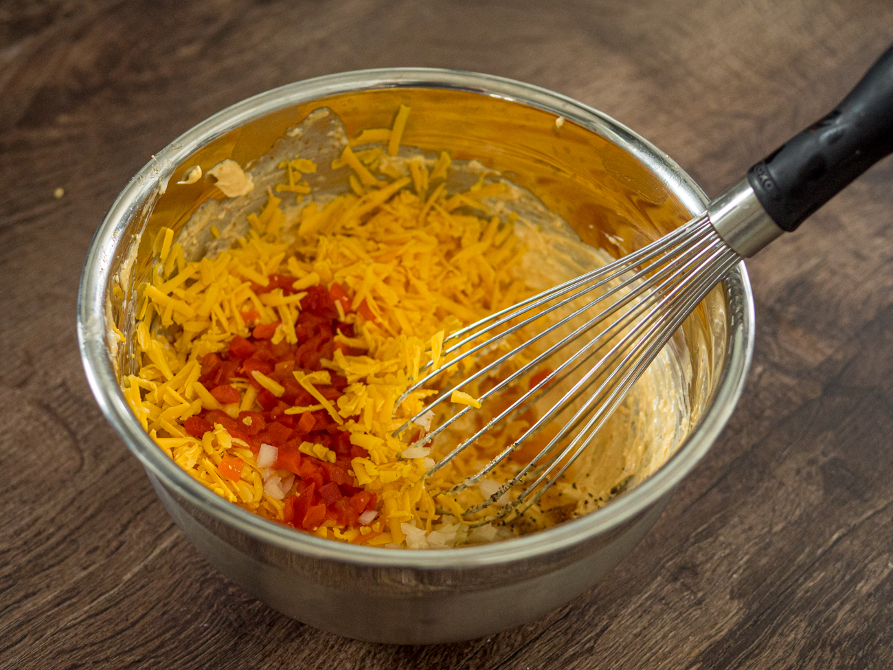 - Stir in the pimentos and reserved juice, onion, and cheddar cheese. Season to taste with salt and pepper.