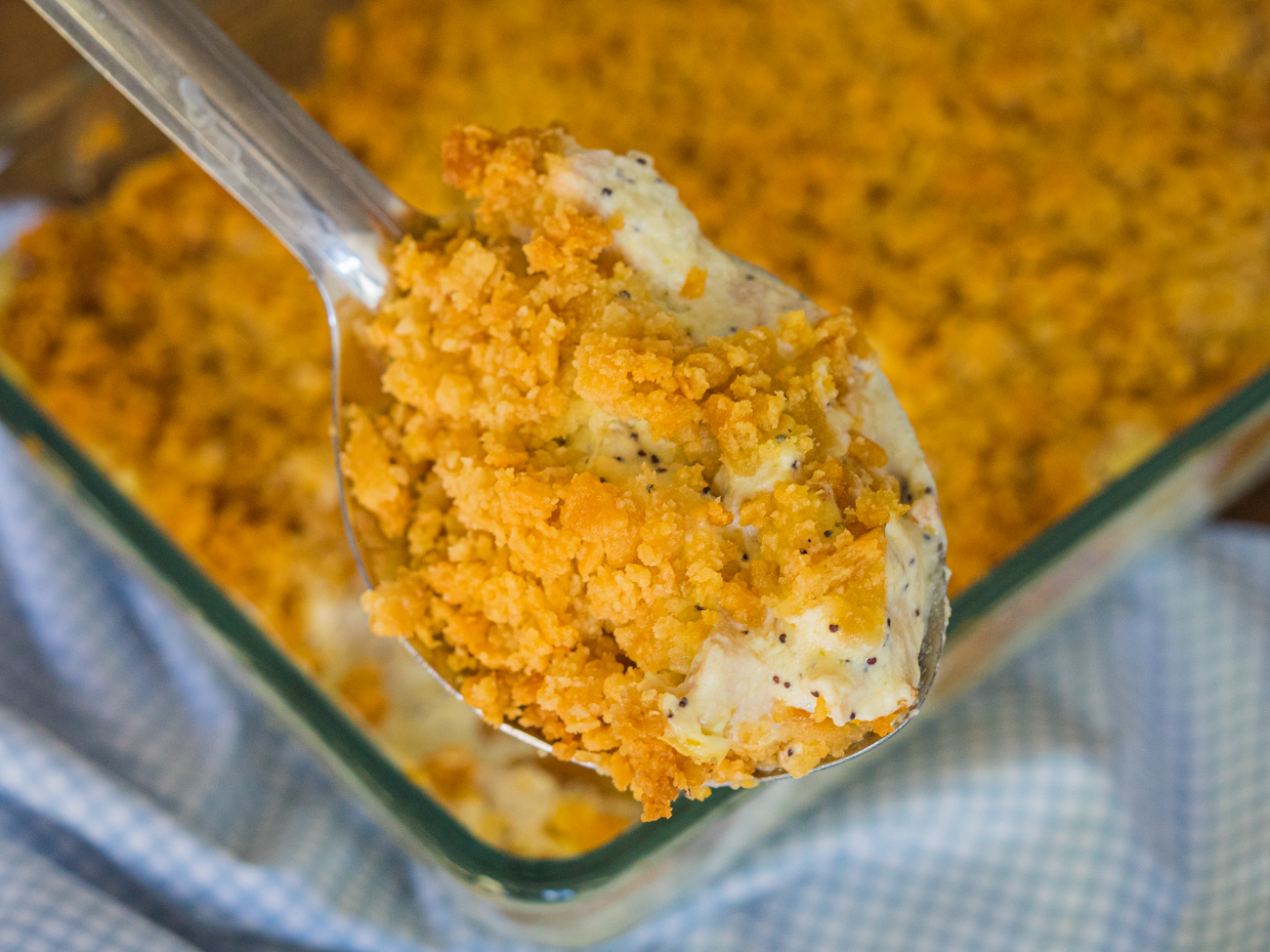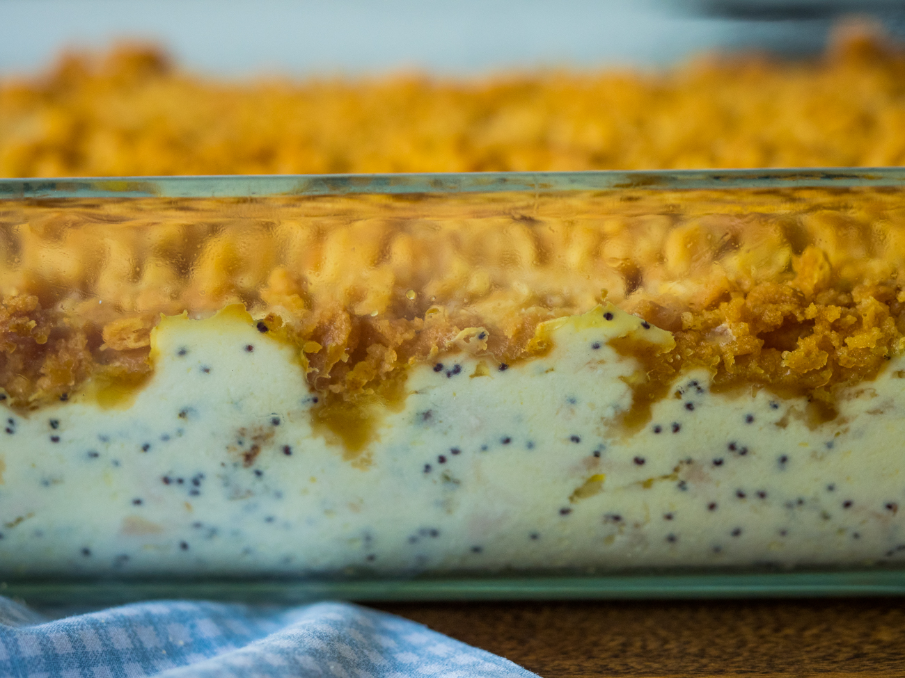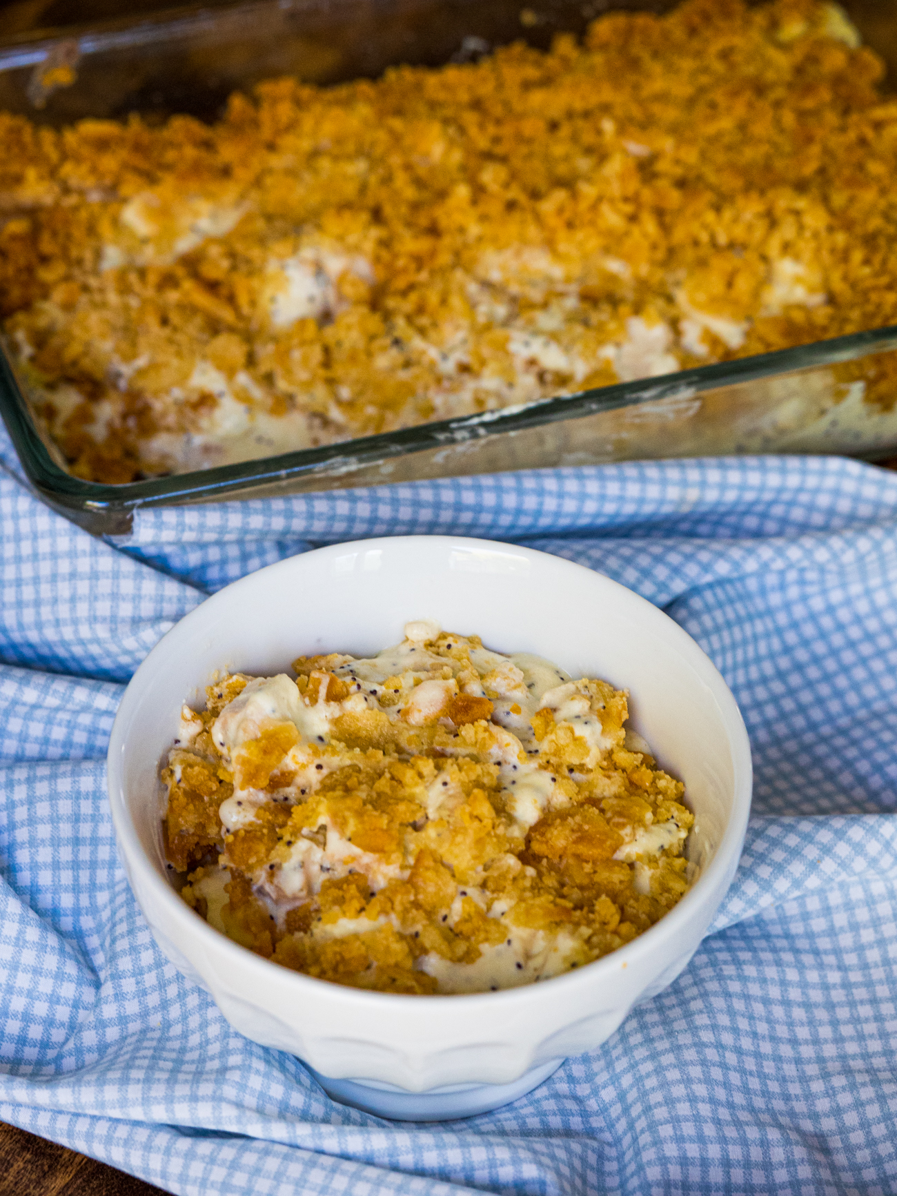 The sauce begins with one of those retro casserole mainstays – condensed cream of chicken soup – but you can’t argue with the fact that there are some places where a cream of ‘whatever’ soup just works. This is one of them. That’s mixed with some sour cream for extra creaminess and also poppy seeds, which lend that delicate and slightly sweet pop that only poppy seeds can.