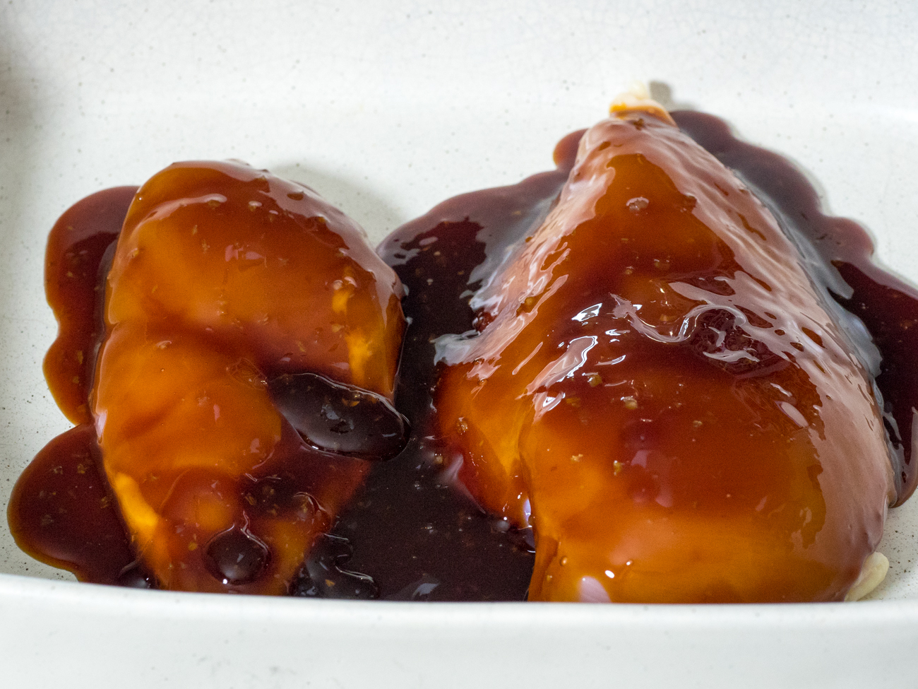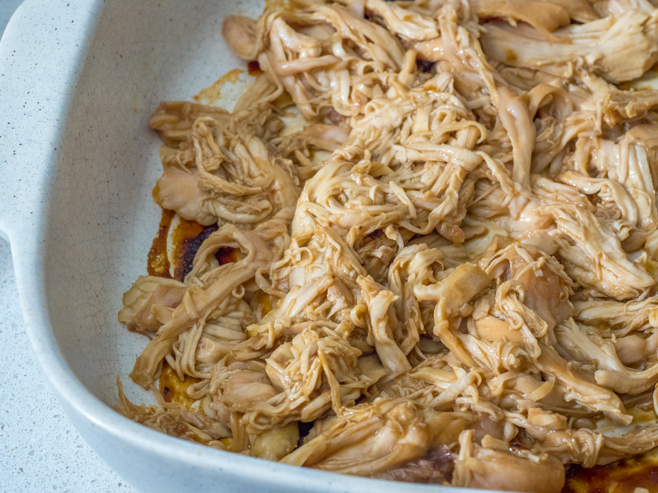 - Arrange chicken in prepared baking dish and top with one cup of the teriyaki sauce. Bake until cooked through, about 30 minutes. Shred chicken in baking dish.