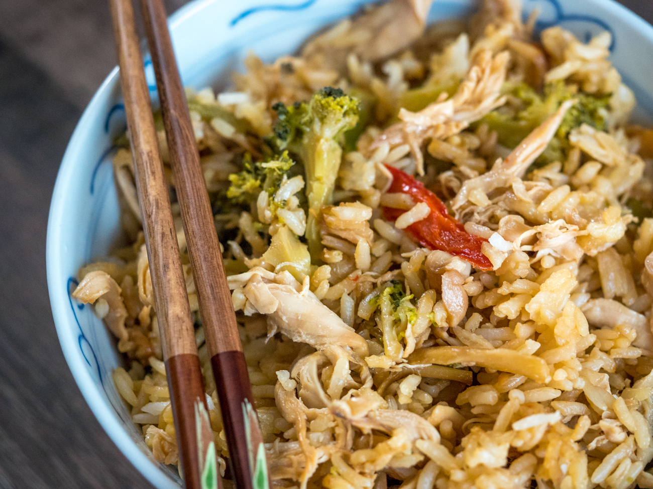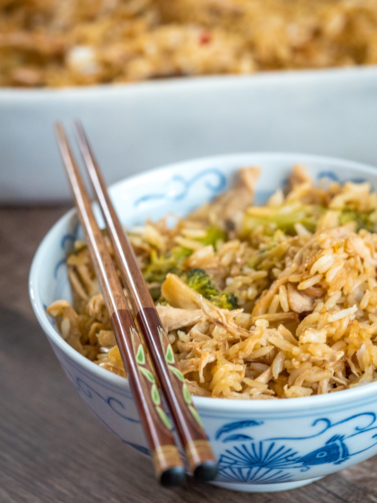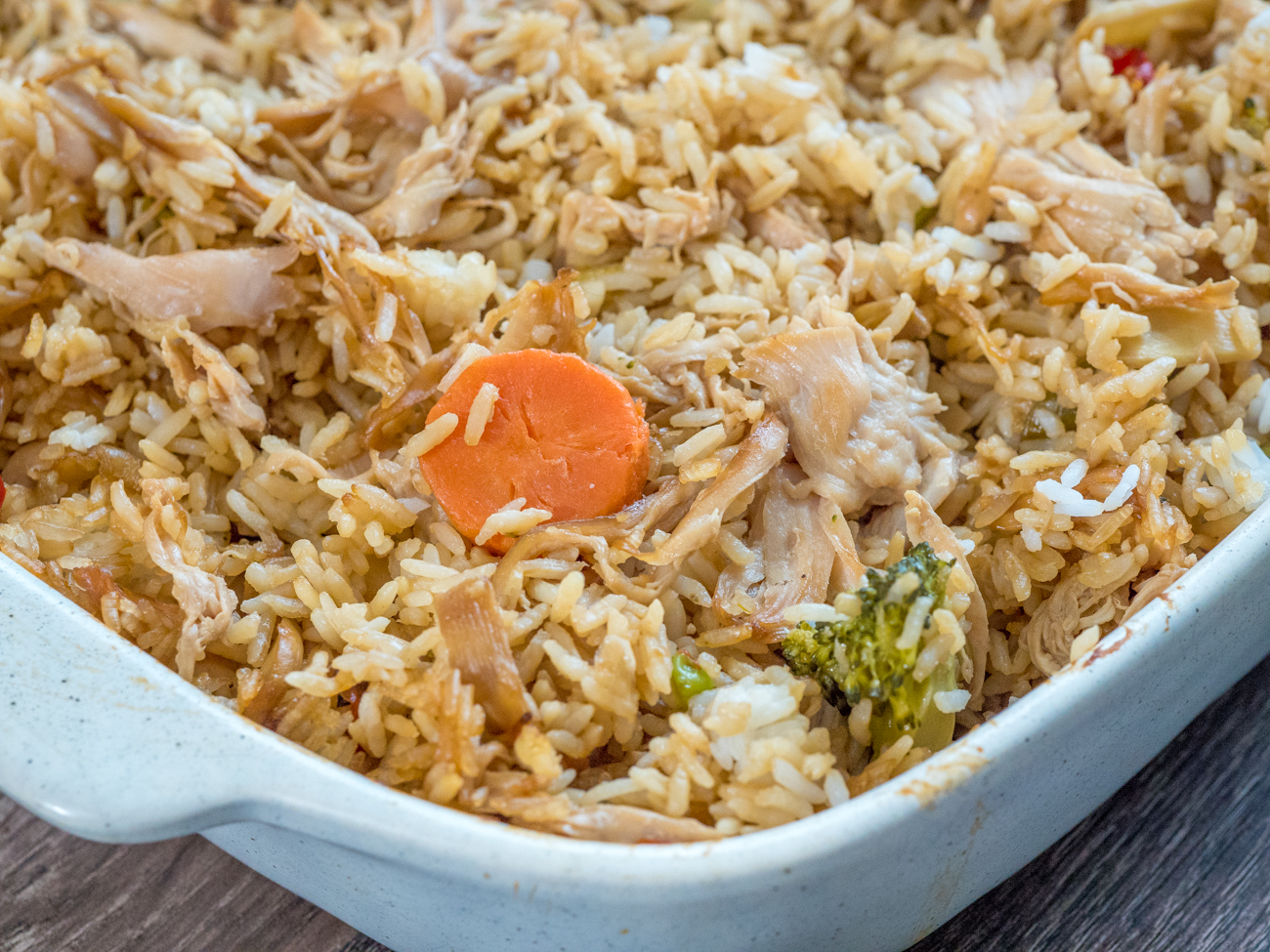 You shred the chicken and stir in some rice and mixed stir-fry veggies and let the whole thing take a turn in the oven again, just long enough for the flavors to come together.