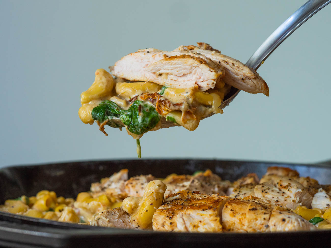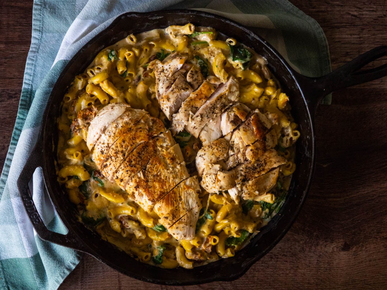 If I could have mac and cheese every day without it adversely affecting my health, I would definitely go for it. I love it that much. I could sit down to a basic, standard homemade macaroni and cheese every single day without ever tiring of it, but luckily that would never be necessary. There are about a million and one ways to switch up your mac and cheese game, like this One Pot Tuscan Chicken Mac and Cheese. It’s as cheesy, creamy, and comforting as any good mac and cheese should be, but it’s dressed up with tangy sun-dried tomatoes and earthy spinach. Oh, and it won’t even take you a half hour to make.