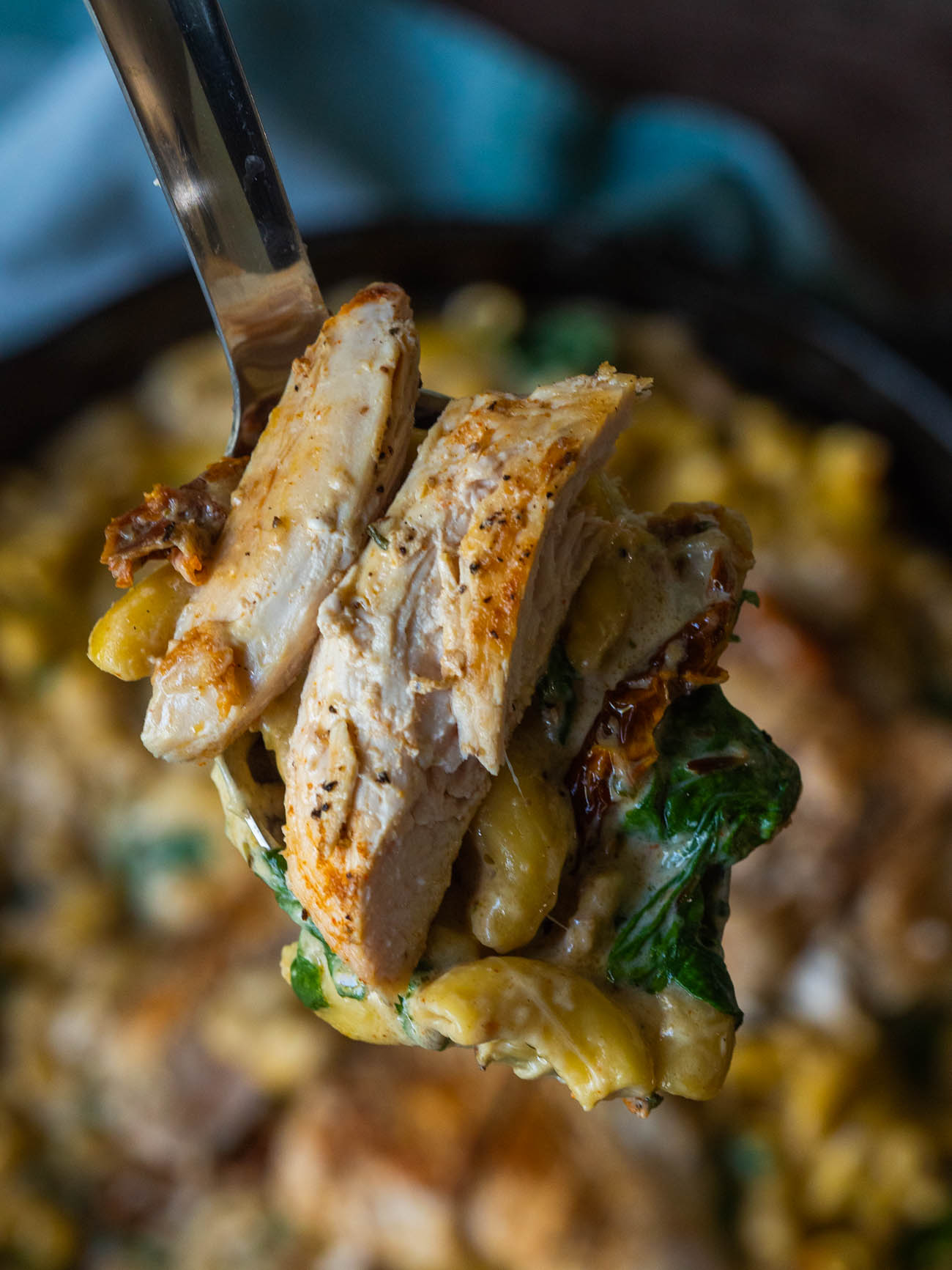I’m all about the one-pot pastas lately, because they make for great quick and satisfying weeknight meals, but this one has definitely taken the lead. The combination of the seared, seasoned chicken breast with the chew of the noodles in that creamy, cheesy sauce is just about perfect, and the Tuscan flavor combo of spinach and sun-dried tomato has this slight sharpness that cuts through the richness in a way that only lifts it up.